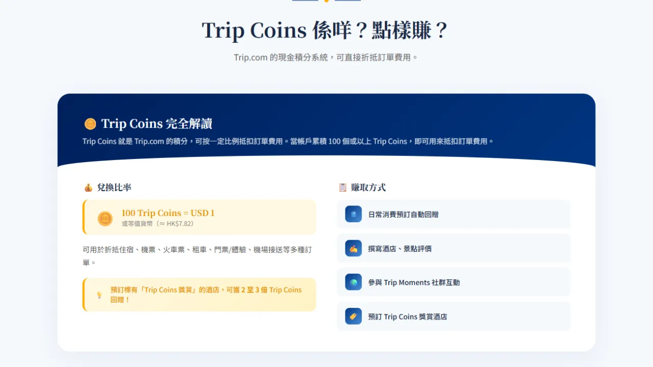 Trip Coins 就是 Trip.com 的積分,可按一定比例抵扣訂單費用。除了日常消費,用戶亦可透過撰寫酒店、景點評價或參與 Trip Moments 社群互動賺取 Trip Coins。使用方法簡單,當帳戶累積 100 個或以上 Trip Coins,即可用來抵扣訂單費用,兌換比率為 100 Trip Coins = USD 1(或等值貨幣)。此外,預訂標有「Trip Coins 獎賞」標籤的酒店,更可獲得 2 至 3 倍 Trip Coins 回贈。