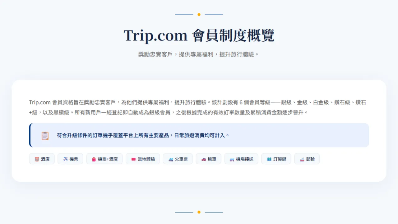 Trip.com 會員計劃目前設有 6 個等級,分別為銀級、金級、白金級、鑽石級、鑽石+級及黑鑽級,訂得越多,等級越高,禮遇越豐富。