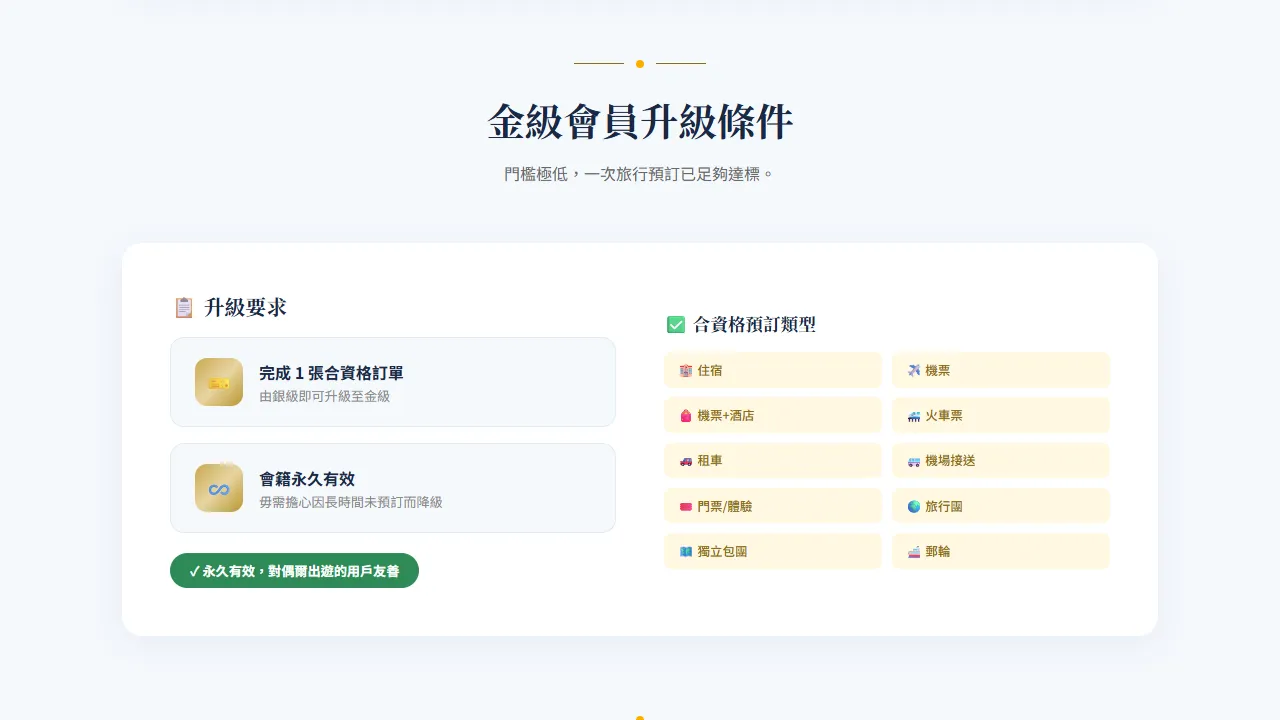金級會籍有效期: 成為金級會員後,您的會籍將永久有效。毋需擔心因長時間未預訂而降級,對偶爾出遊的用戶而言相當友善。