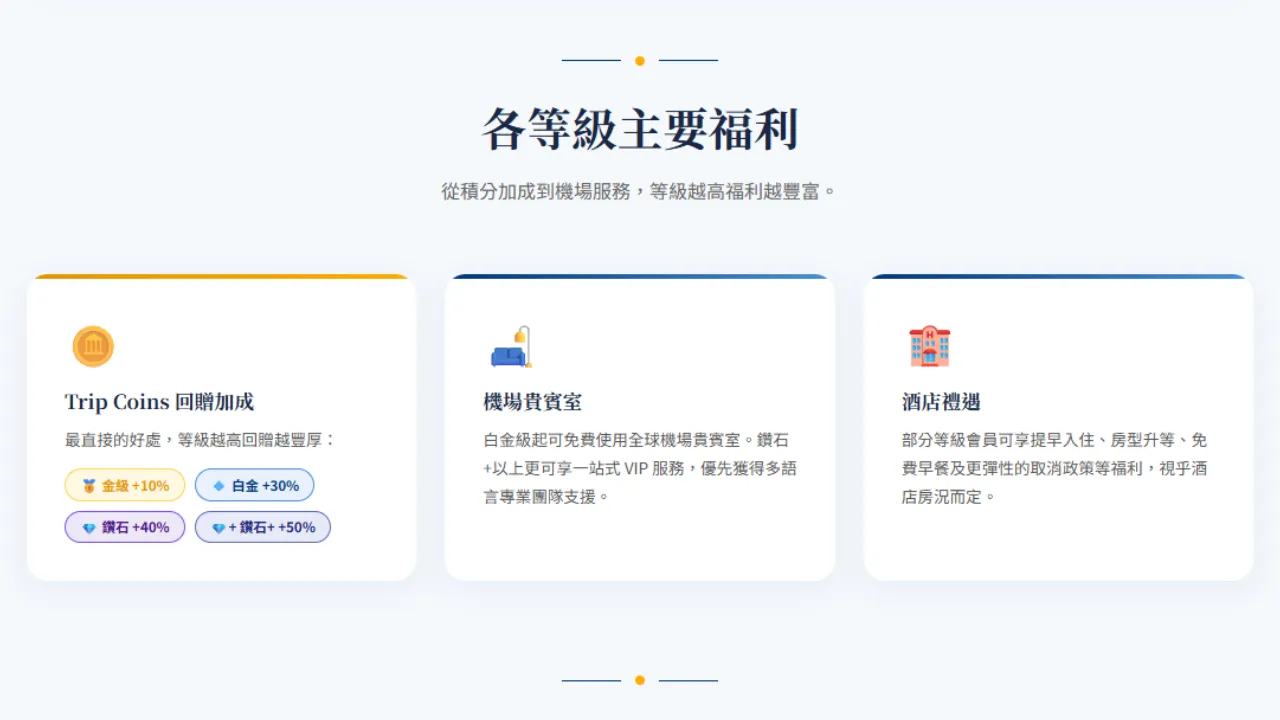 Q3:金級與銀級的 Trip Coins 回贈有咩分別? 金級會員可享額外 20% Trip Coins 回贈,而銀級則只有基礎回贈率,未設任何額外加成。對於常用 Trip.com 的旅客,升至金級後長遠積分回報相當可觀。