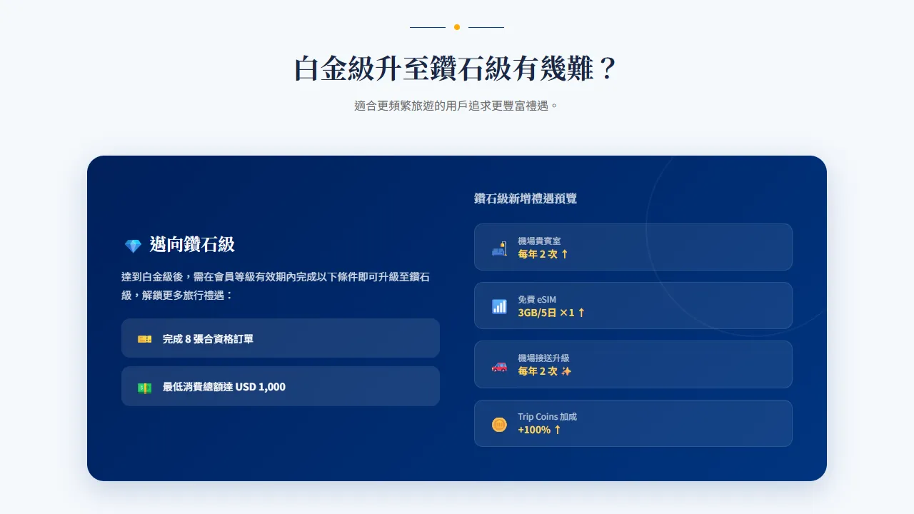 若想繼續晉升,達到白金級後,需在會員等級有效期內完成 8 張合資格訂單,且最低消費總額達 USD 1,000,即可升級至鑽石級。鑽石級進一步解鎖每年 2 次機場貴賓室使用權、機場接送車型升級等更豐富禮遇,適合更頻繁旅遊的用戶追求。